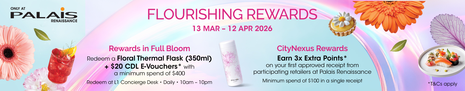 - Rewards in Full Bloom: Redeem a Floral Thermal Flask (350ml) + $20 CDL E-Vouchers^ with a minimum spend of $400